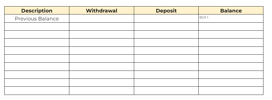 Your first transaction is a $100 transfer from your savings account. Because it was your 7th transfer, you also incurred a $25 transfer fee. Record both of these in the table to start. Then enter the simulation events as follows: