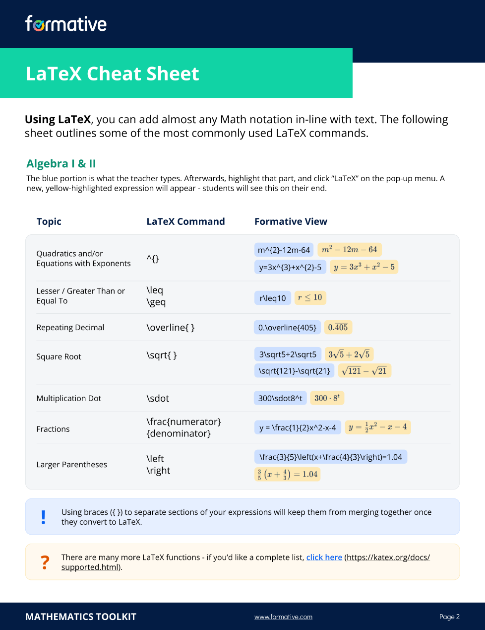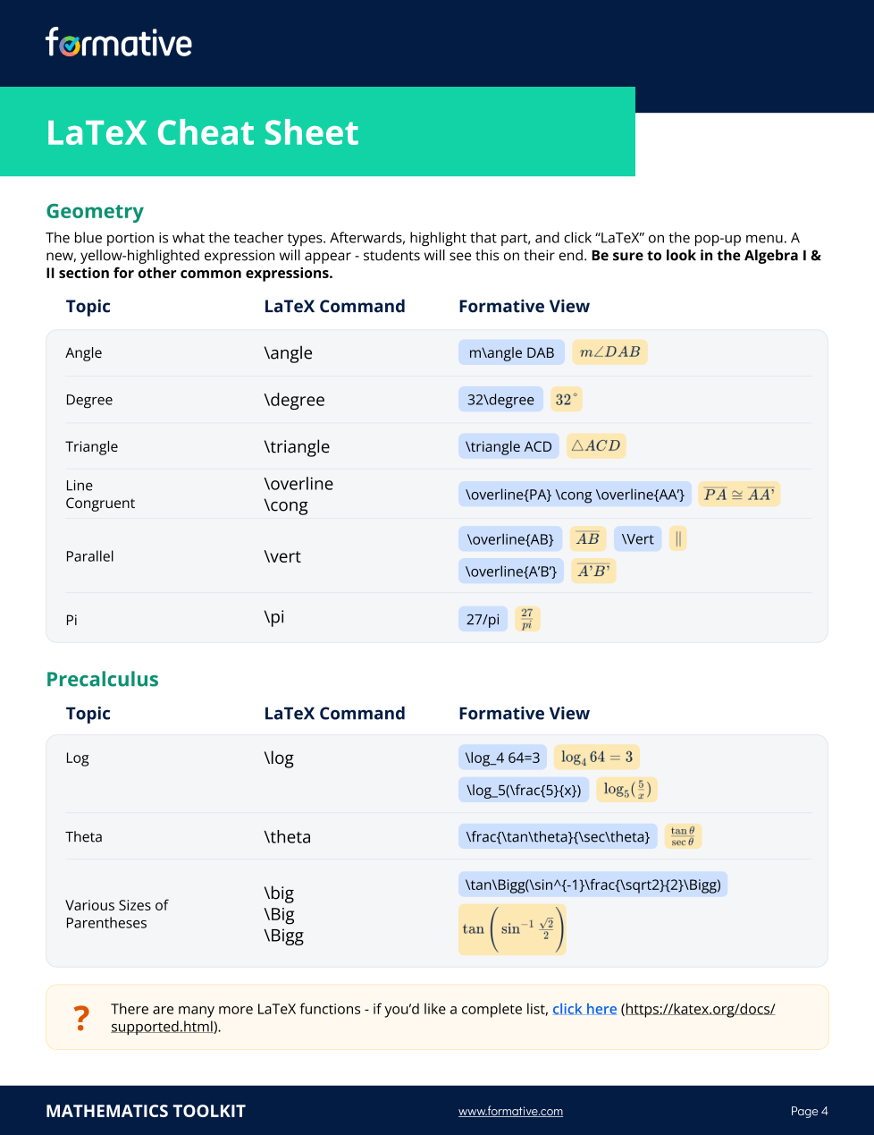 This formative is designed to help you kickstart your use of LaTeX in your math classroom assessments. Add it to your activities and use it as a reference!