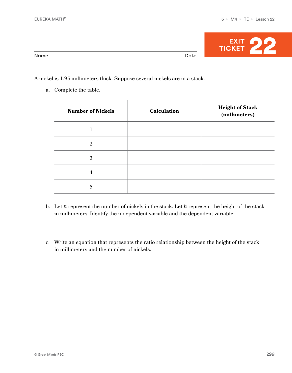 Write an equation that represents the ratio relationship between the height of the stack in millimeters and the number of nickels.