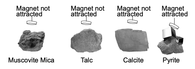 Students were then provided four minerals and completed certain tasks to identify the properties of each mineral. The table below shows the observations for four of the five properties that the students observed. The photographs below show the response of a strong magnet when brought close to each mineral.