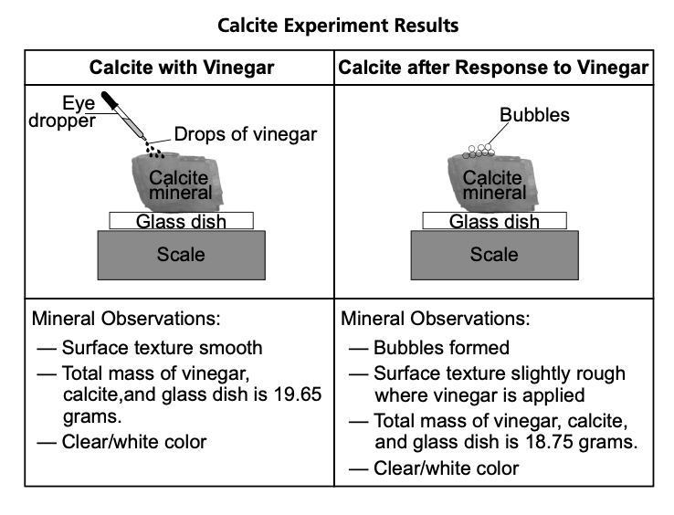 The students then placed calcite onto a glass dish and placed it on a scale. Using an eye dropper, ten drops of vinegar were placed on top of the calcite and the total mass was recorded.