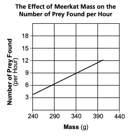The graph shows the relationship between the mass of a meerkat and the number of prey found per hour.