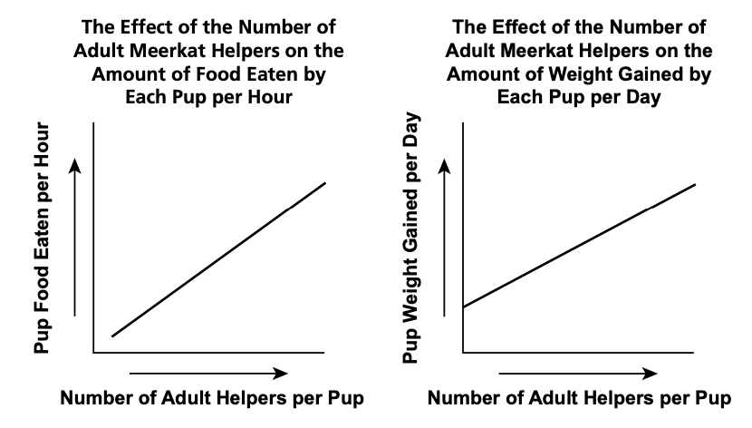 The graphs show the effects of the number of adult meerkat helpers, per pup, on pups in a mob.