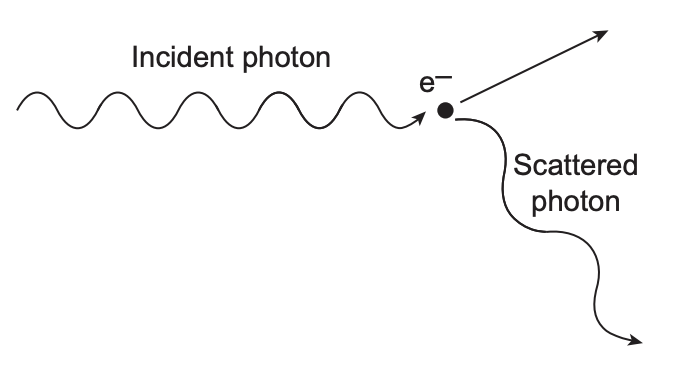 After the collision, the electron recoils and the photon is scattered in another direction with a longer wavelength than the incident photon. The increase in photon wavelength results because, during the collision, the photon