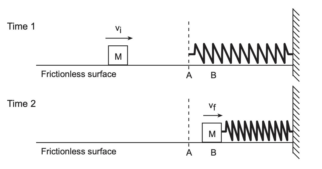 As shown in the diagram below, mass M slides across a level, frictionless surface with speed vi​. The mass strikes a spring at position A, causing the spring to compress. When the mass is at position B, it is moving at a slower speed, ​vf.