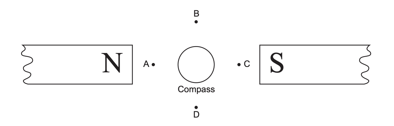 The diagram below shows a magnetic compass placed between unlike magnetic poles.