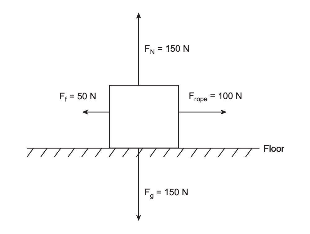Four forces act on a crate on a level floor, as shown in the diagram below.