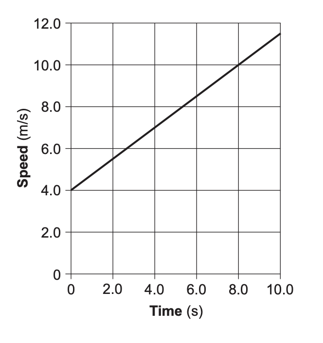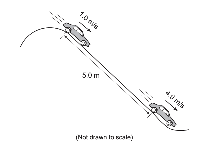 As shown in the diagram below, a toy car, initially traveling at 1.0 meter per second, uniformly accelerates to a speed of 4.0 meters per second as it travels down a 5.0-meter-long slope.