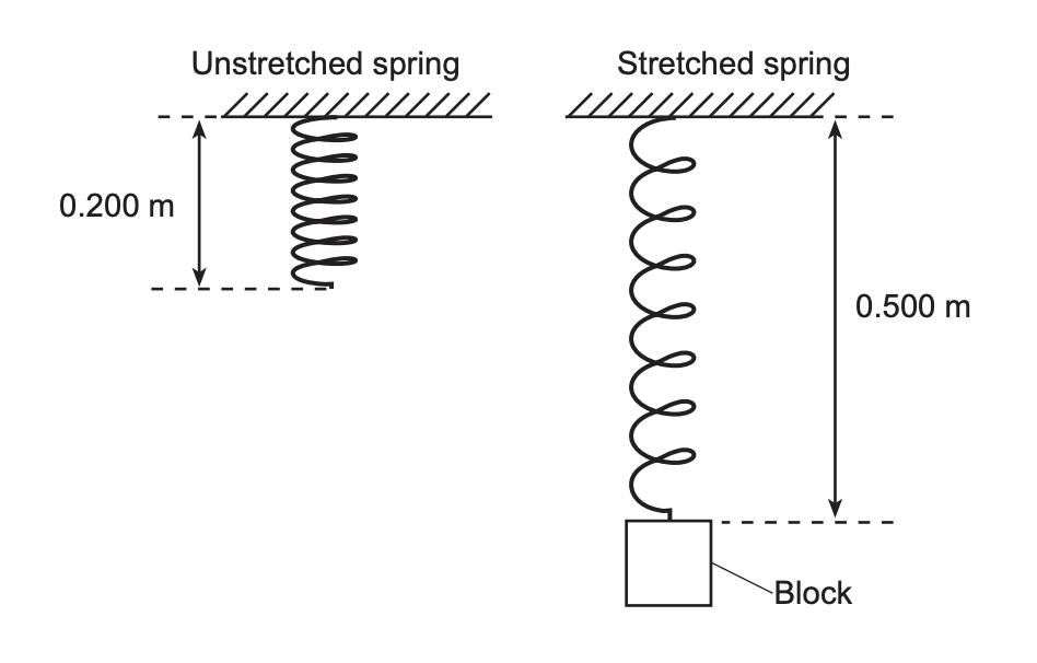 As shown in the diagram below, a block is hanging motionless from a vertical spring, having caused the spring to elongate from its unstretched length of 0.200 meter to a length of 0.500 meter. The spring has a spring constant of 250. newtons per meter.