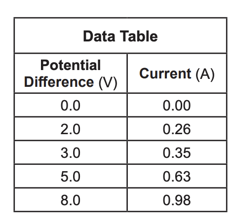 In an experiment, a resistor is connected to a source of varying potential difference. A voltmeter and an ammeter are included in the circuit so that the current can be measured at different potential difference settings. The data table below shows the potential differences and currents measured.