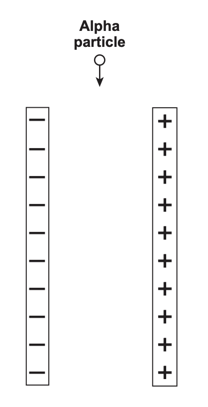 An alpha particle with a charge of +2 elementary charges is moving toward two oppositely charged parallel plates, as shown in the diagram below. The magnitude of the electric field strength between the plates is 5.0 \times 10^4 newtons per coulomb.