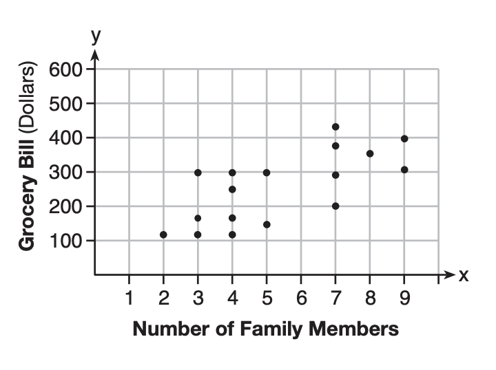 The scatter plot below shows the relationship between the number of members in a family and the amount of the family’s weekly grocery bill.
