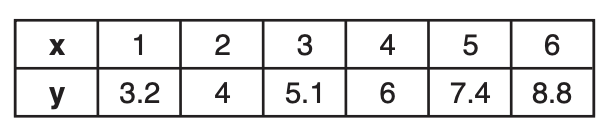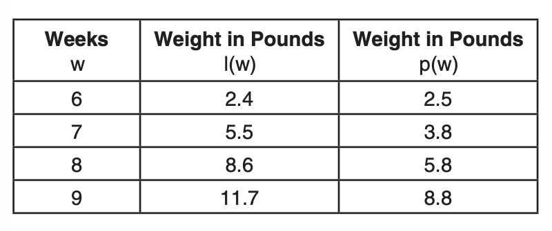 The table below shows the weights of Liam’s pumpkin, l(w), and Patricia’s pumpkin, p(w), over a four-week period where w represents the number of weeks. Liam’s pumpkin grows at a constant rate. Patricia’s pumpkin grows at a weekly rate of approximately 52%.
