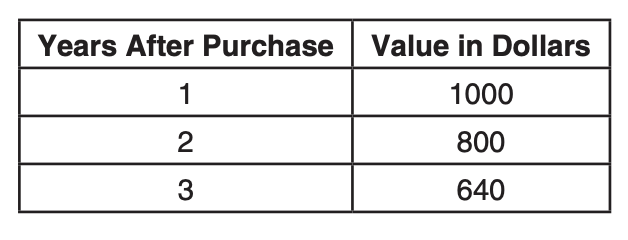 Marc bought a new laptop for $1250. He kept track of the value of the laptop over the next three years, as shown in the table below.