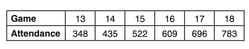 The number of people who attended a school’s last six basketball games increased as the team neared the state sectional games. The table below shows the data.