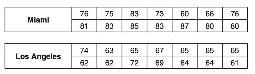 Santina is considering a vacation and has obtained high-temperature data from the last two weeks for Miami and Los Angeles.