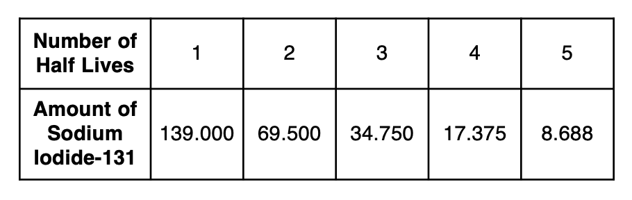 Sodium iodide-131, used to treat certain medical conditions, has a half-life of 1.8 hours. The data table below shows the amount of sodium iodide-131, rounded to the nearest thousandth, as the dose fades over time.