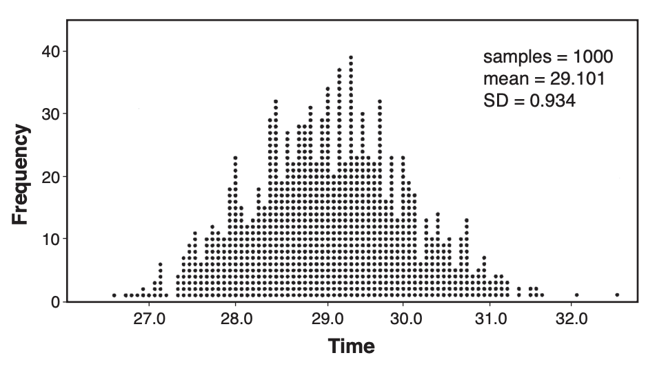 Based on the simulation results, is the claim that commuters listen to the station on average 30 minutes plausible? Explain your response including an interval containing the middle 95% of the data, rounded to the nearest hundredth.
