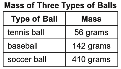 Some students investigated energy and force for three types of balls. The students used a tennis ball, a baseball, and a soccer ball. The table below shows the mass of the three balls.