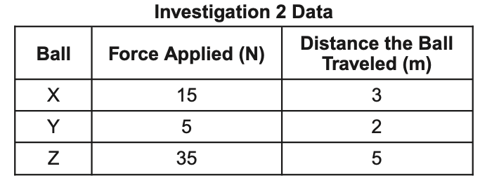 In Investigation 2, the students tried to hit each golf ball with the same amount of force. Their results show they did not succeed. Using the locations of the three golf balls, circle the golf ball that had the mostenergy transferred from the plastic golf club to the ball.