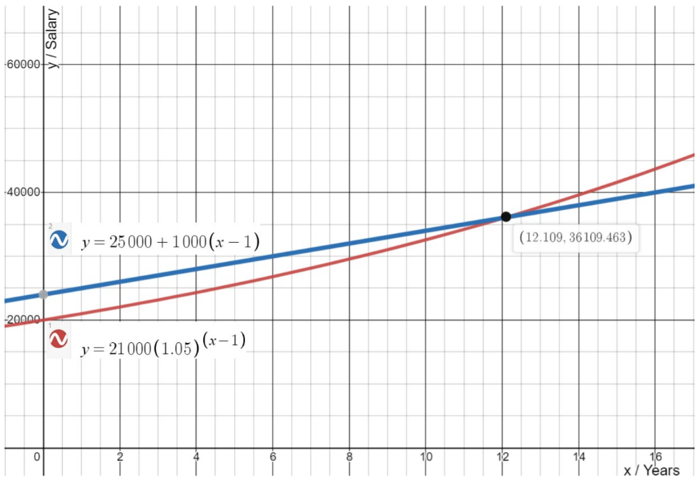 You are given the following contract offers based on each of the functions with x representing years of work and y representing your salary in dollars: