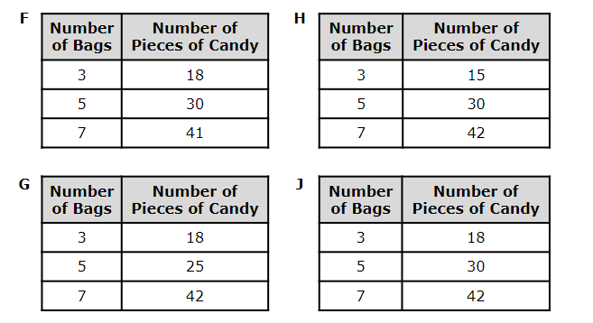 8. Ronaldo is assembling party-favor bags to hand out at his birthday party. Each bag will have six pieces of candy in it. Which table represents the number of pieces of candy he will need for different numbers of bags?