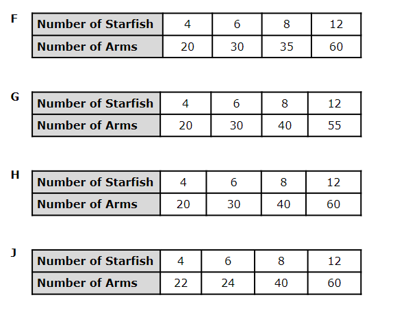 10. Danielle found some starfish on the beach, and she noticed they each had five arms. Which table shows the number of arms on different numbers of starfish?