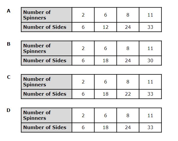 5. There are three sides on a fidget spinner. Which table shows the number of sides on different numbers of spinners?