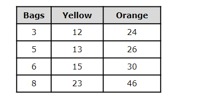7. Iyana wants to know how many different-colored candies are in a bag. The table below shows the number of yellow and orange candies in different bags.