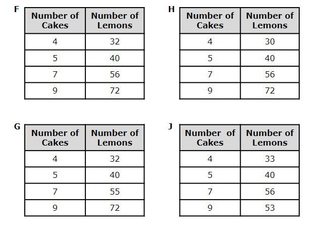 4. A bakery is making lemon cakes for sale at their store. Each lemon cake uses eight lemons. Which table represents the number of lemons needed for different numbers of cakes?