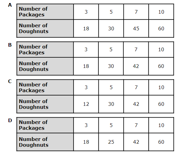 1. There are six donuts in each package at the grocery store. Which table shows the number of donuts in different numbers of these packages?