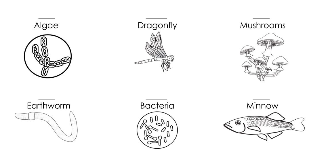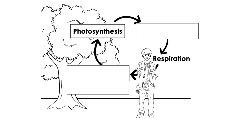 Complete the diagram with the matter exchanged between producers and consumers during photosynthesis and respiration.