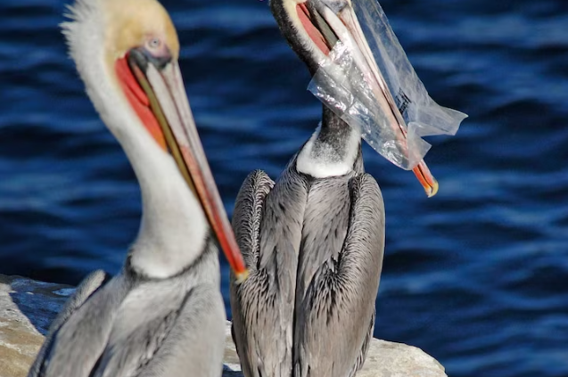 Birds and sea animals are getting caught in plastic rings and nets. Fish are swallowing small pieces. Plastics are full of poisons.