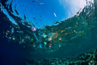 The ocean is filling up with plastic garbage. Some is floating on the ocean's surface. The rest is underwater.