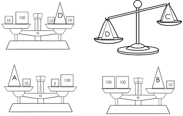 Objects are represented by letters A, B, C, & D. Put the objects in order from least to greatest mass (least on top). All amounts are shown in grams.