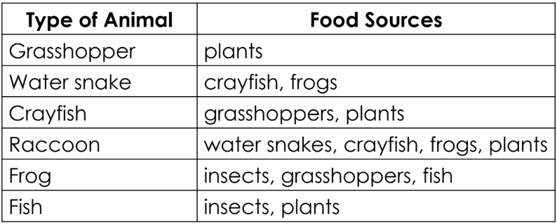 The table below shows the food sources for several types of animals that live in a marsh.