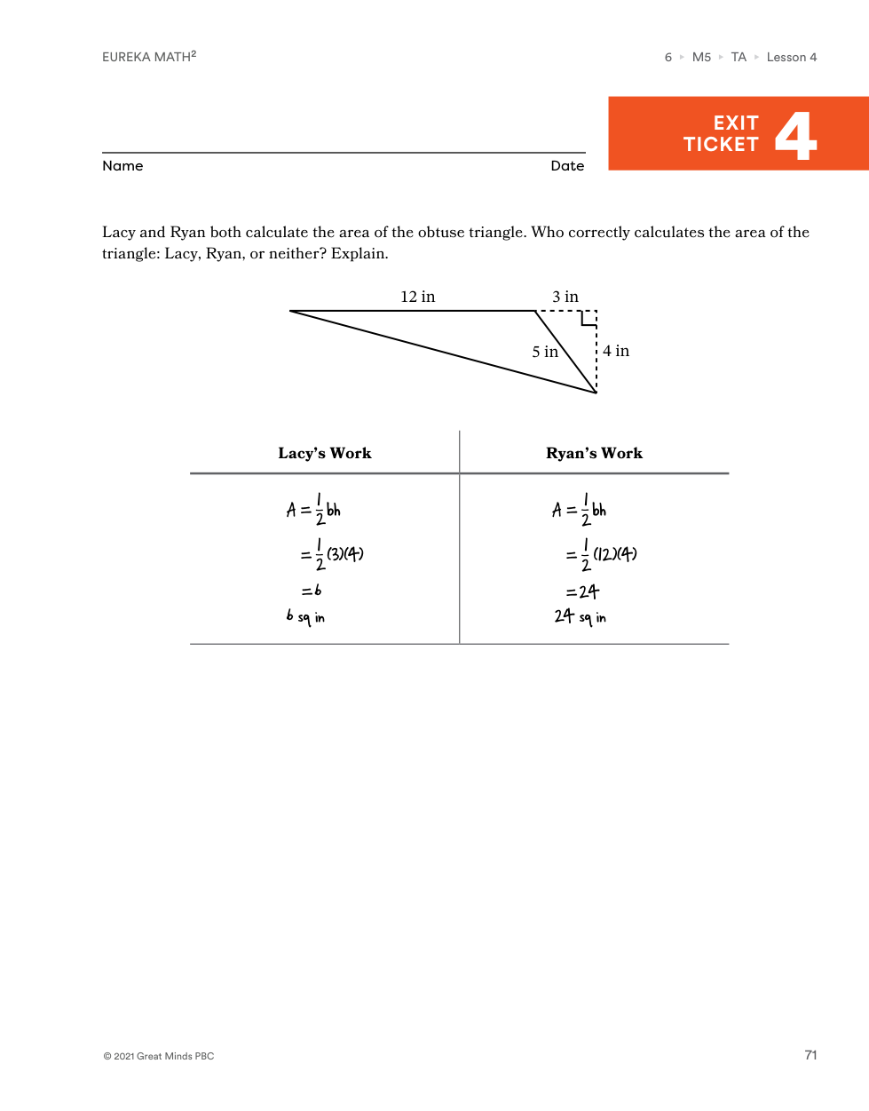 Who correctly calculates the area of the triangle: Lacy, Ryan, or neither? Explain.