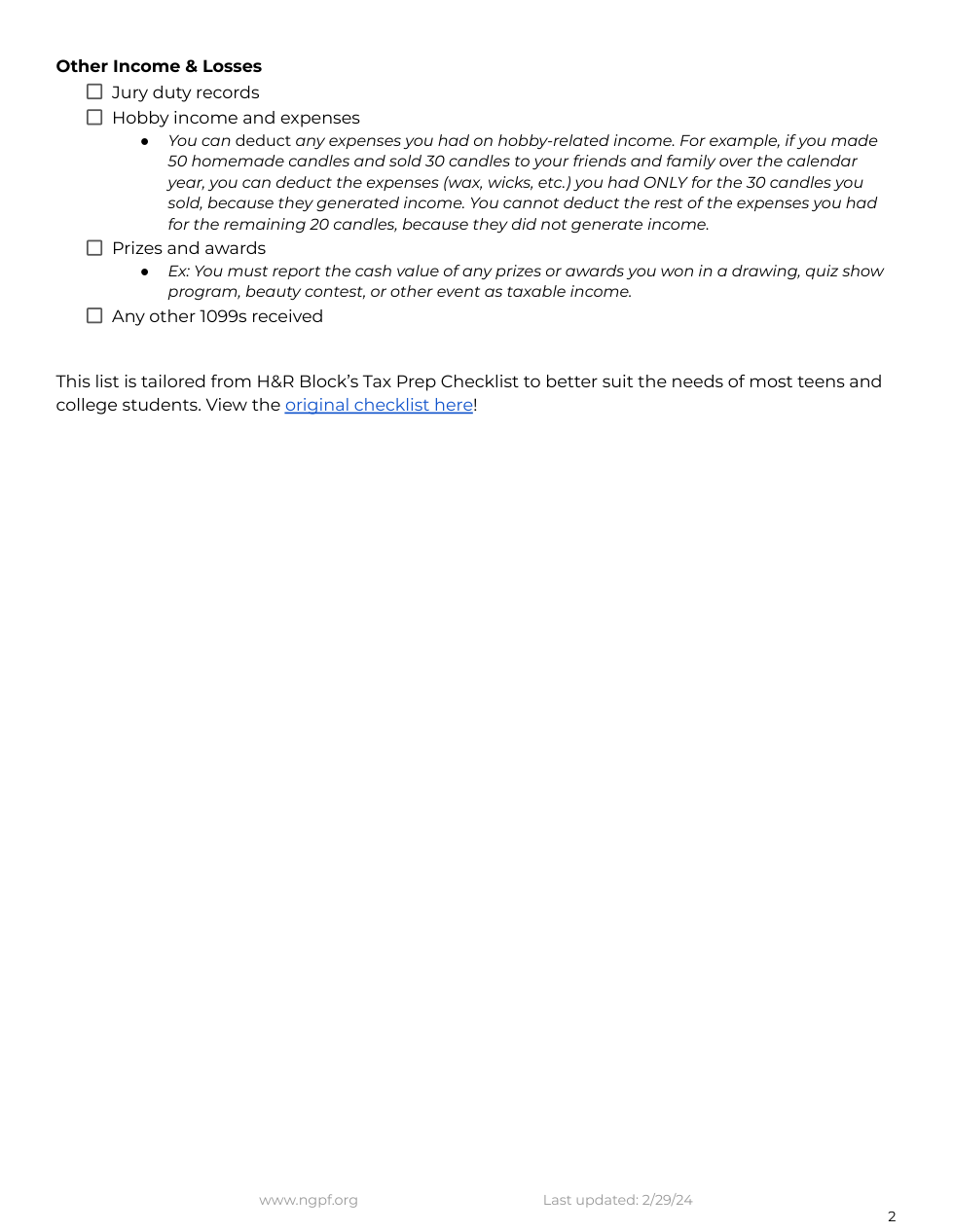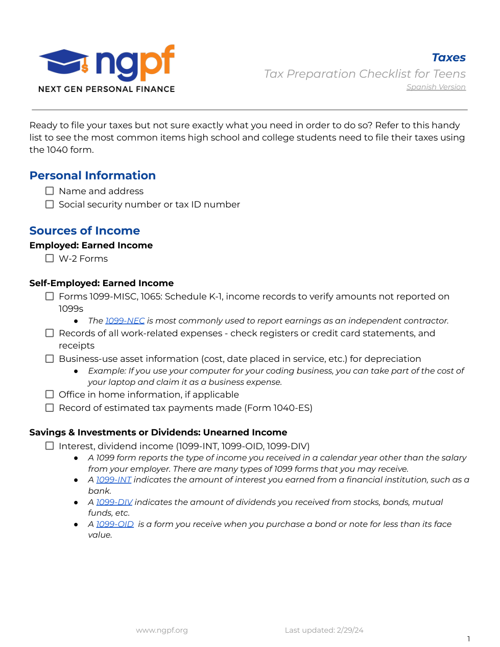What do you need to file your taxes? Review this handy list of items you will need to fill out the 1040 form. Check off the items you’re confident you will have ready. Take note of any items you’re unsure or have any questions about.