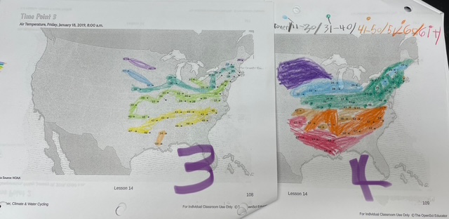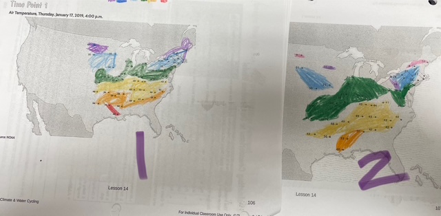 Now look at maps 3 and 4. Make 2 observations of what you see different between the two maps. You can mention location or the temperature with numbers.