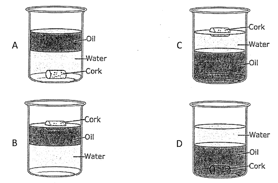 Which diagram shows what would most likely happen if oil, water, and a cork were all place in one container?