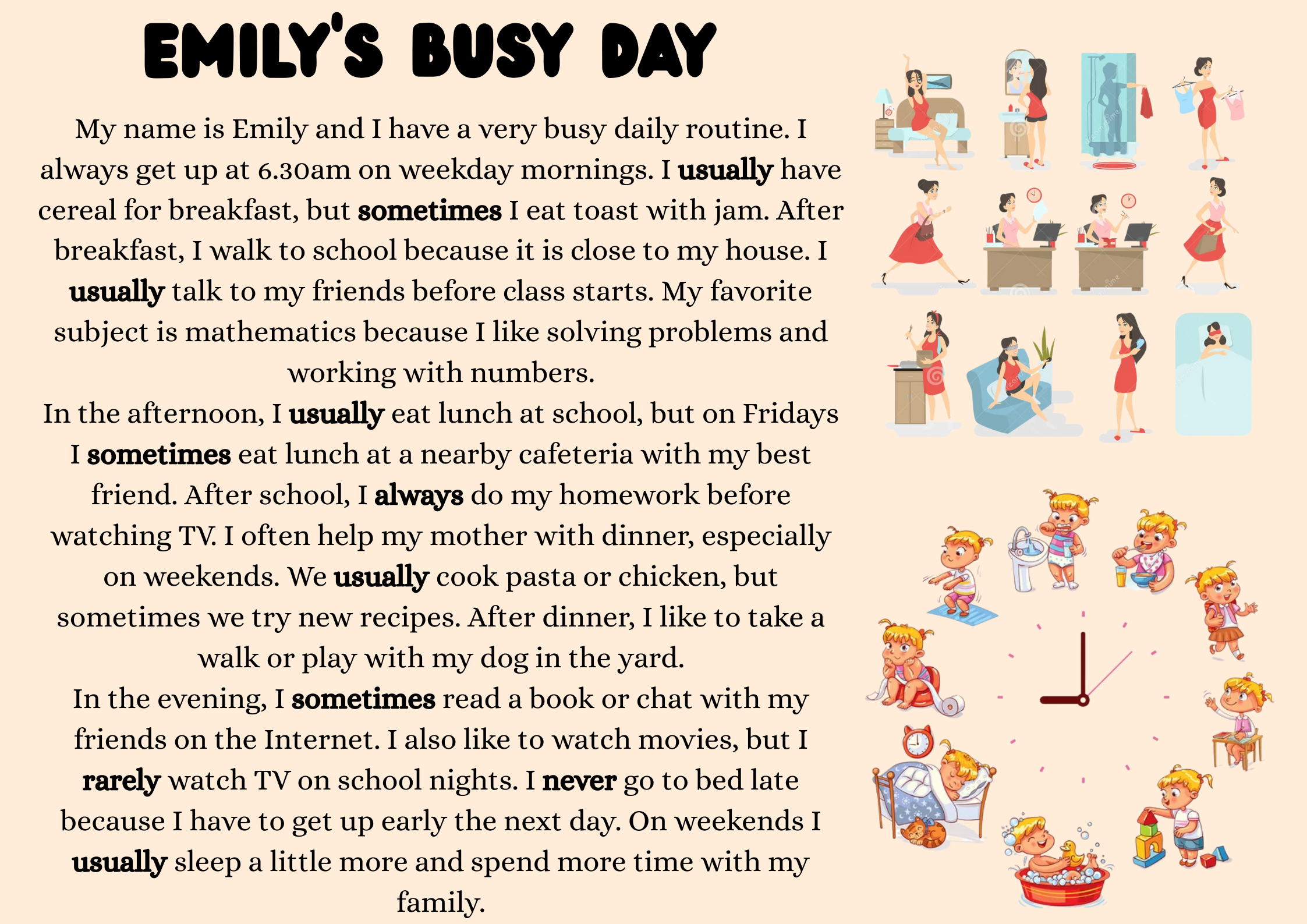 In the following questions you will find an image where Emily, describing her daily routine, answers according to the reading.