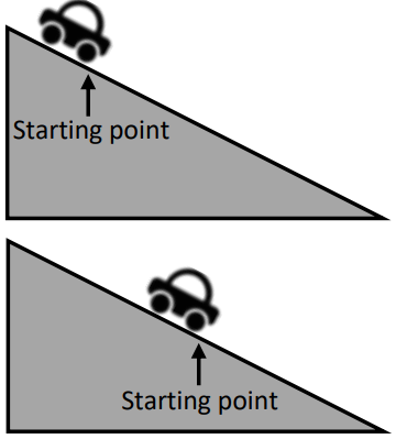 A student released a toy car from the top of a ramp and measured the distance the toy car traveled. The student then released the same toy car from the middle of the ramp and measured the distance the toy car traveled.