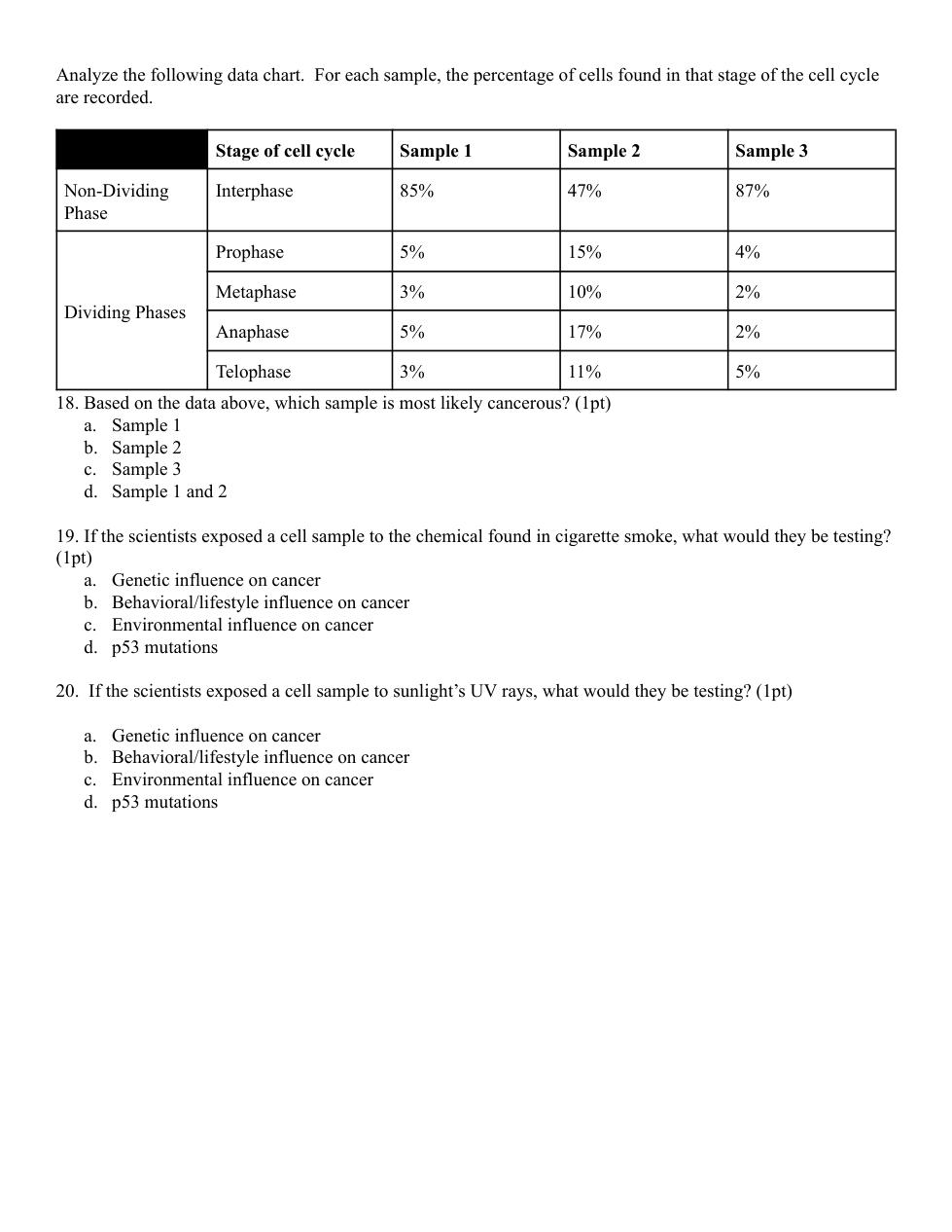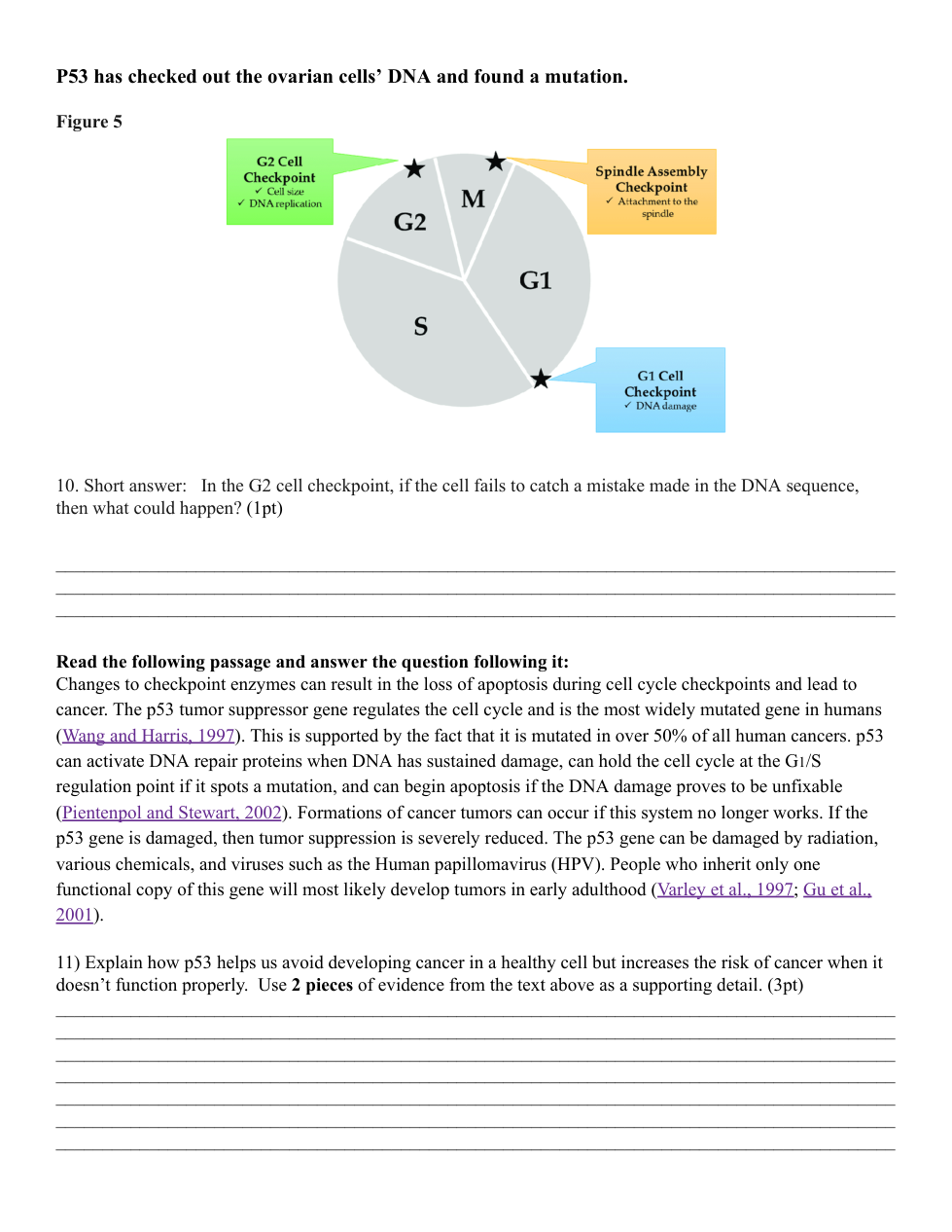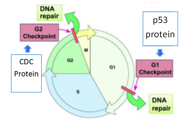 Changes to checkpoint enzymes can result in the loss of apoptosis during cell cycle checkpoints and lead to cancer. The p53 tumor suppressor gene regulates the cell cycle and is the most widely mutated gene in humans (Wang and Harris, 1997). This is supported by the fact that it is mutated in over 50% of all human cancers. p53 can activate DNA repair proteins when DNA has sustained damage, can hold the cell cycle at the G1/S regulation point if it spots a mutation, and can begin apoptosis if the DNA damage proves to be unfixable (Pietenpol and Stewart, 2002). Formations of cancer tumors can occur if this system no longer works. If the p53 gene is damaged, then tumor suppression is severely reduced. The p53 gene can be damaged by radiation, various chemicals, and viruses such as the Human papillomavirus (HPV). People who inherit only one functional copy of this gene will most likely develop tumors in early adulthood (Varley et al., 1997; Gu et al., 2001).