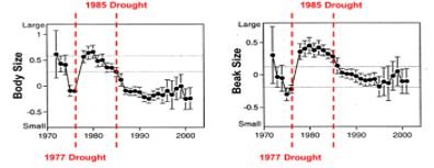 Years later, scientists still study differences in the finches on the island. Data was collected on body size and beak size from 1970 to 2000. As shown in the data tables below, there were two droughts. During each drought, the decrease in rainfall led to a decrease in the number of berries available for the finch diet. The finches only had hard seeds as a primary food source.
