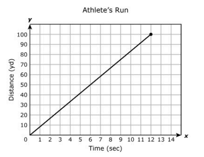 An athlete ran at a constant speed for 12 seconds. The part of the linear function shown represents the distance the athlete ran in yards, y, as a function of the time in seconds, x.