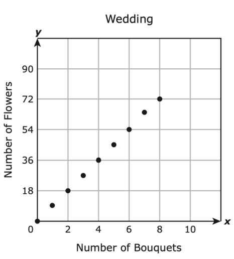 A florist is making bouquets of flowers for a wedding. Each bouquet will have 9 flowers. The graph shows the linear relationship between y, the number of flowers used, and x, the number of bouquets.