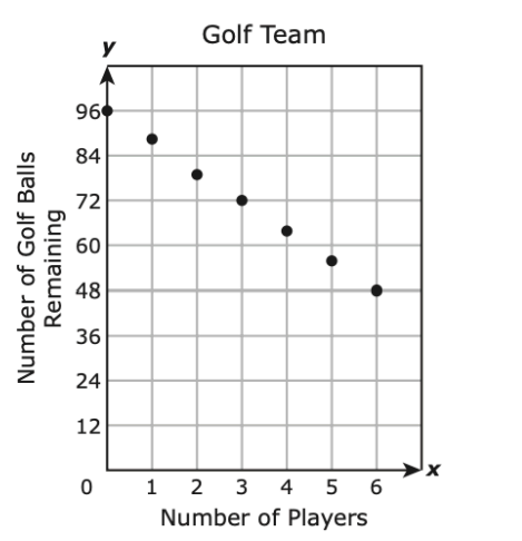 A coach has 96 golf balls for the school’s golf team. The coach will give each player on the team 8 golf balls. The graph shows the linear relationship between y, the number of golf balls remaining for the team, and x, the number of players on the team.