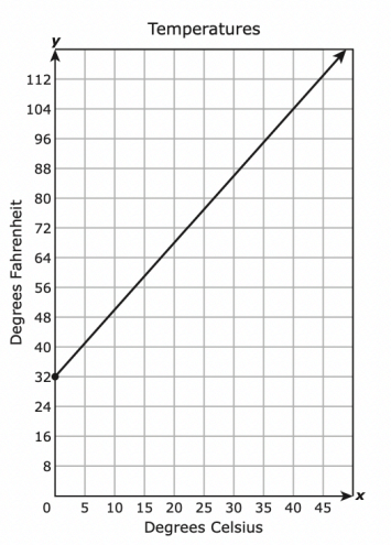 The conversion of degrees Celsius to degrees Fahrenheit can be represented by a linear relationship. The graph shows the linear relationship between y, the temperature in degrees Fahrenheit, and x, the temperature in degrees Celsius from the freezing point of water.