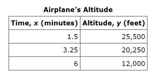 The altitude of an airplane is changing at a constant rate. The table shows the linear relationship between y, the altitude of the airplane in feet, and x, the time in minutes.