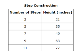 A construction worker built steps up to a home. The table shows the linear relationship between the height off the ground in inches and the number of steps.